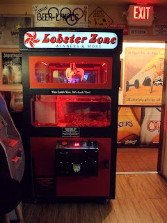 But my point, and I do have one, is that we were in a strange place this week, and I had to share one of the most unusal things I have ever seen. For $2 you could use one of those Crane Games that usually retrieve stuffed animals and occasionally get infiltrated by unattended children skinny enough to climb up in them, and catch a live lobster which they would cook for you in their kitchen. A $2 lobster dinner if you had the skill. I did not have enough to drink to properly enjoy this. But that made driving home possible.